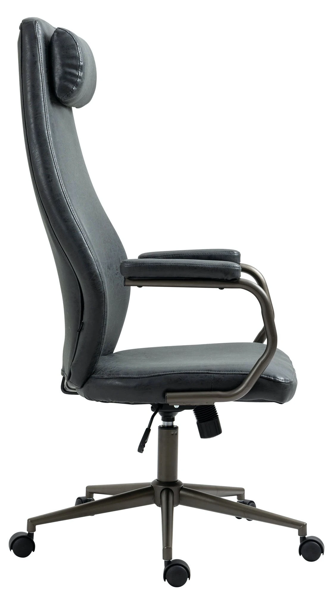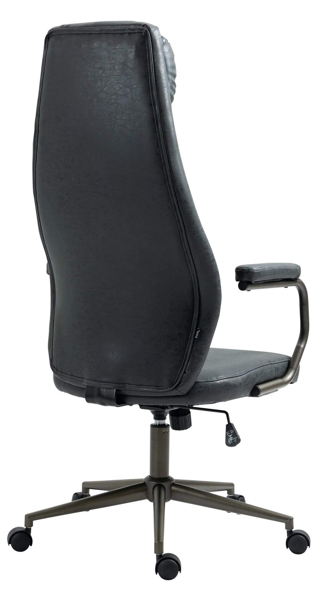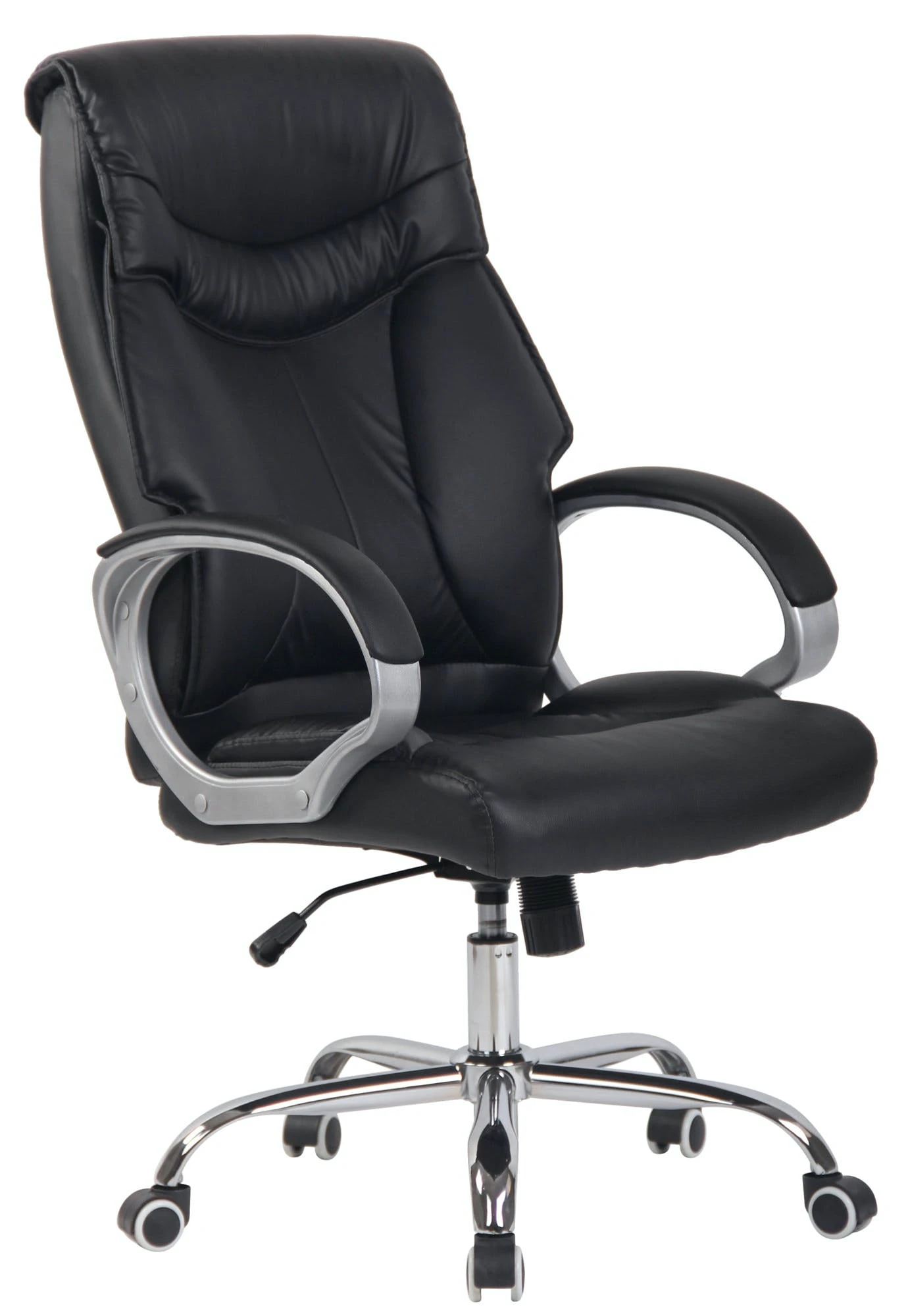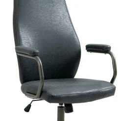 Dieser formschöne Schreibtischstuhl überzeugt nicht nur mit seinem ausgeprägten Industrie-Look, auch in Sachen Komfort kann diesem Bürosessel keiner etwas vormachen. Der strapazierfähige Kunstlederbezug und seine hochwertige Polsterung sorgen für ein angenehmes Sitzgefühl über mehrere Stunden hinweg. Die hohe Rückenlehne hat eine ansprechende Form und die Sitzhöhe des Stuhls ist stufenlos verstellbar und garantiert ein ergonomisches Sitzen. Des Weiteren ist der Bürostuhl mit einem Wippmechanismus ausgestattet, der für mehr Bewegungsfreiheit sorgt. Die Stabilität ist durch das Metallgestell in Schwarz gewährleistet. Durch die fünf Leichtlaufrollen kann man leicht und locker über den Boden rollen – egal ob auf Hart- oder Teppichböden.