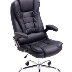 Der Chefsessel Thor ist ein exklusiver Bürostuhl mit einer sehr hochwertigen Polsterung und Kunstlederbezug. Kunstlederbezüge haben den Vorteil, dass sie elastisch sind und sich bei Entlastung wieder glatt ziehen. Dies sieht nicht nur schöner aus, sondern erhöht zusätzlich die Lebensdauer des Sitzbezuges. Das Gestell ist aus Metall in Chromoptik und dadurch sehr stabil.Dank der verstellbaren Sitzhöhe ist ergonomisches Sitzen garantiert. Die Sitzhöhe ist mit dem Hebel unter dem Sitz stufenlos verstellbar. Der eingebaute Wippmechanismus sorgt für mehr Bewegungsfreiheit.Der Bürostuhl steht standsicher auf fünf Leichtlaufrollen. Egal ob Hart- oder Teppichböden – Sie werden immer leicht und locker über den Boden rollen können.