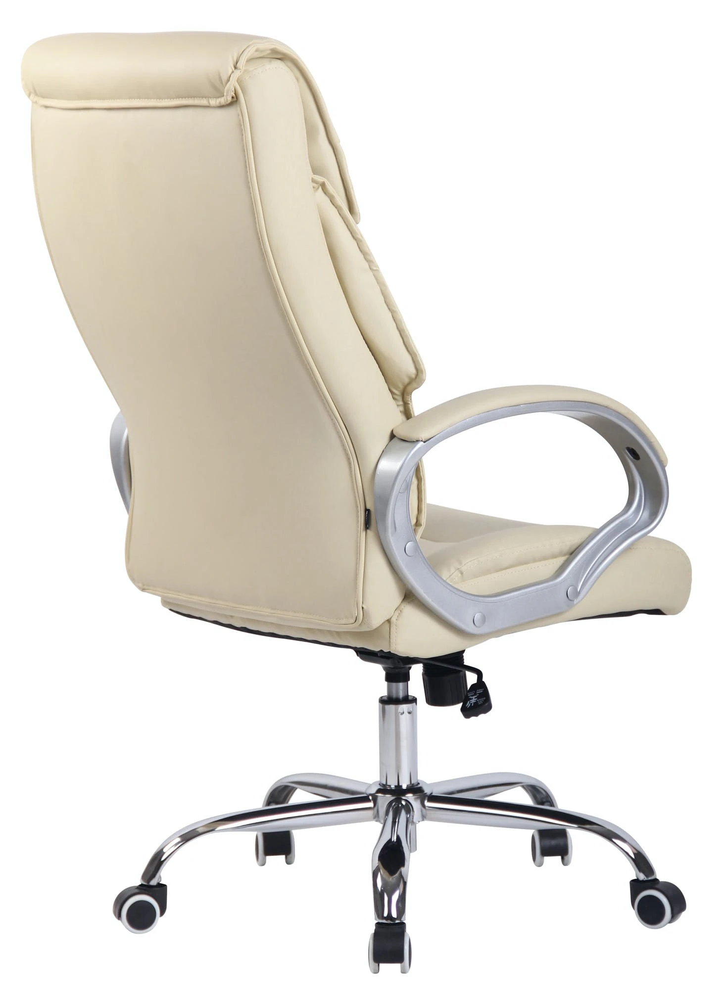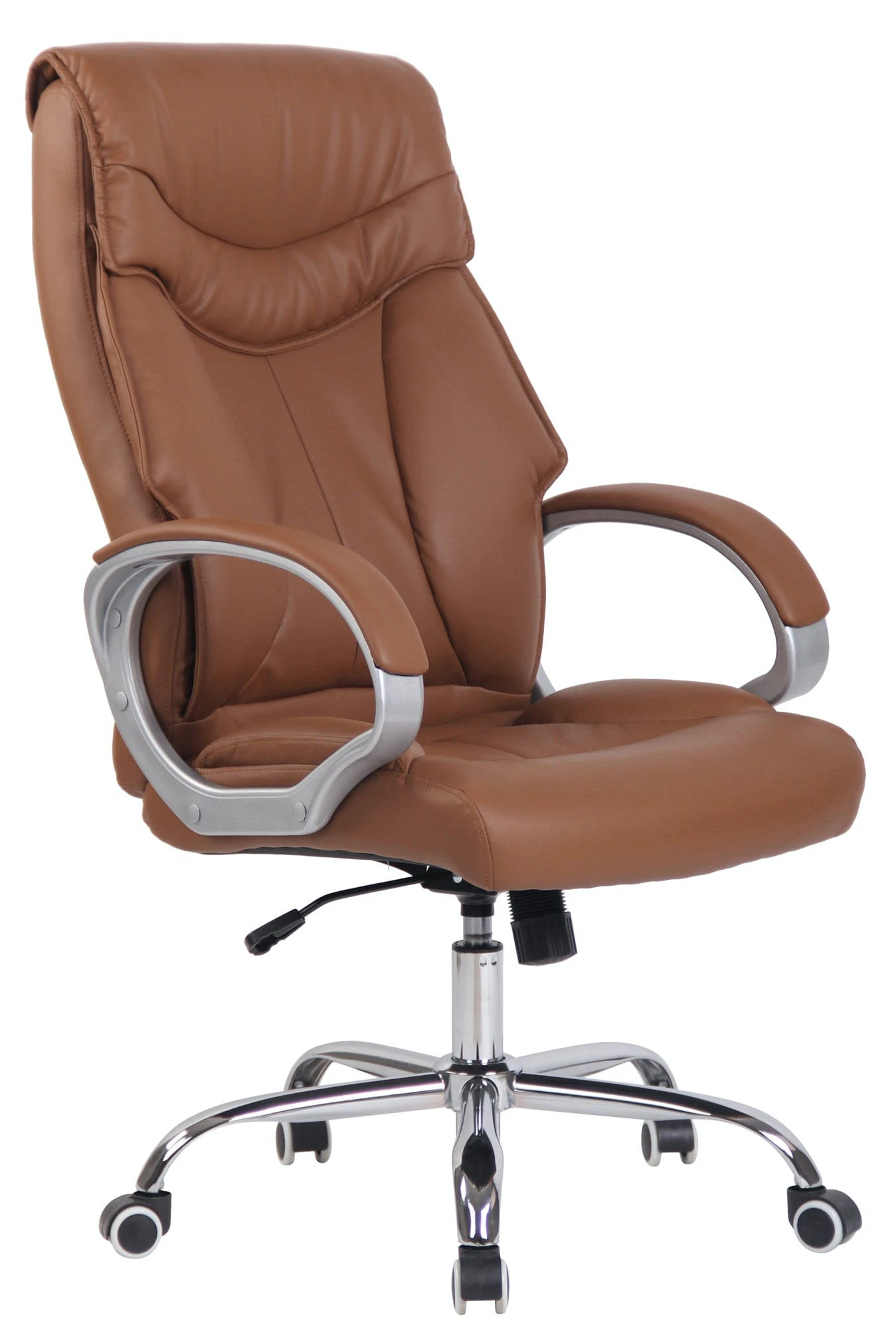 Der Chefsessel Torro ist ein extrem hochwertiger Bürostuhl mit einer sehr hochwertigen Polsterung und Kunstlederbezug. Kunstlederbezüge haben den Vorteil, dass sie elastisch sind und sich bei Entlastung wieder glatt ziehen. Dies sieht nicht nur schöner aus, sondern erhöht zusätzlich die Lebensdauer des Sitzbezuges. Kunstlederbezüge sind außerdem atmungsfähig, was grade bei hohen Temperaturen ein Vorteil ist. Das Gestell ist aus Metall in Chromoptik und sehr stabil. Die Sitzhöhe ist stufenlos verstellbar. Der Stuhl verfügt über einen eingebauten Wippmechanismus für mehr Bewegungsfreiheit. Der Bürostuhl verfügt über 5 sehr robuste Leichtlaufrollen. Egal ob Hart- oder Teppichböden – Sie werden immer leicht und locker über den Boden rollen können.