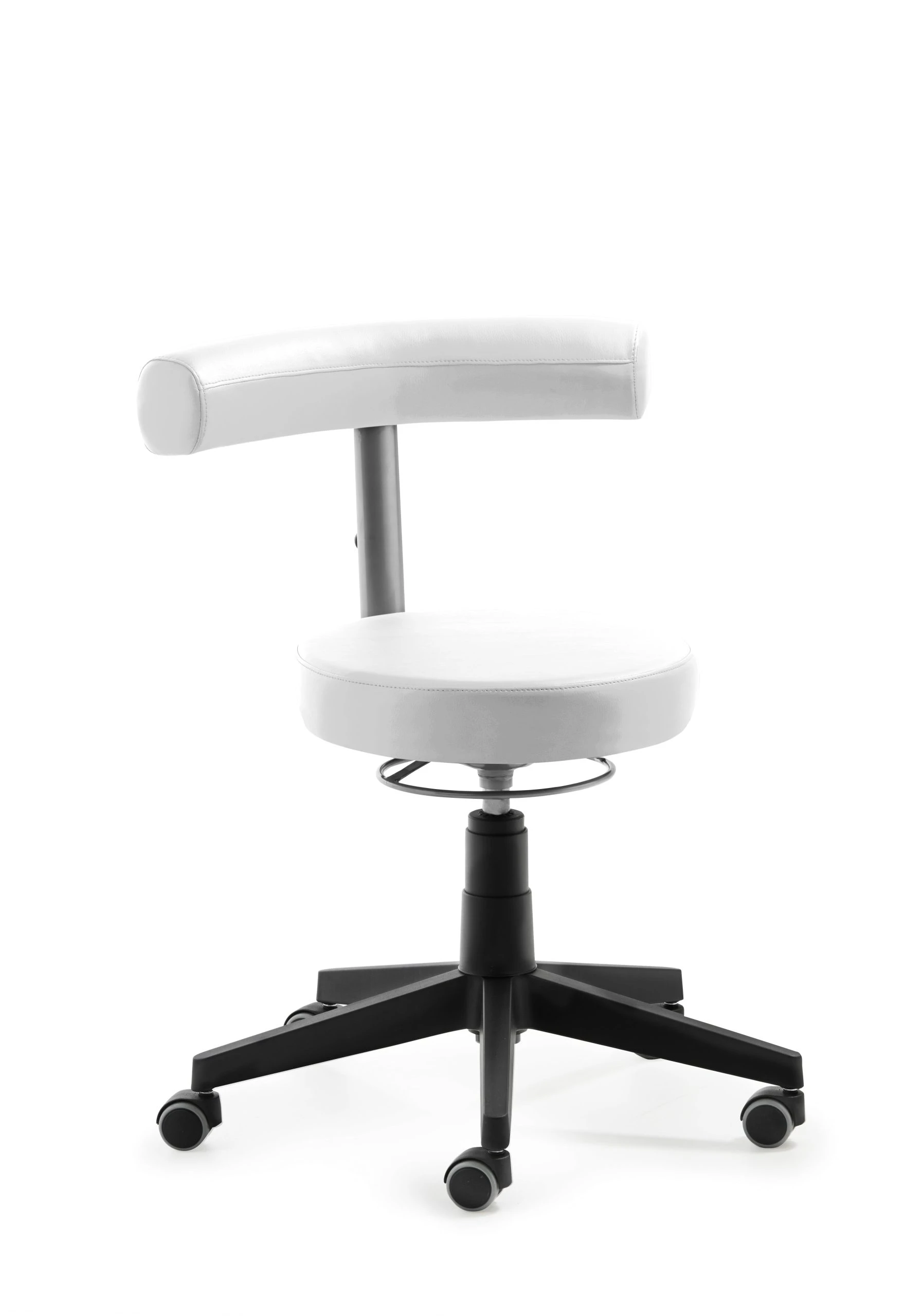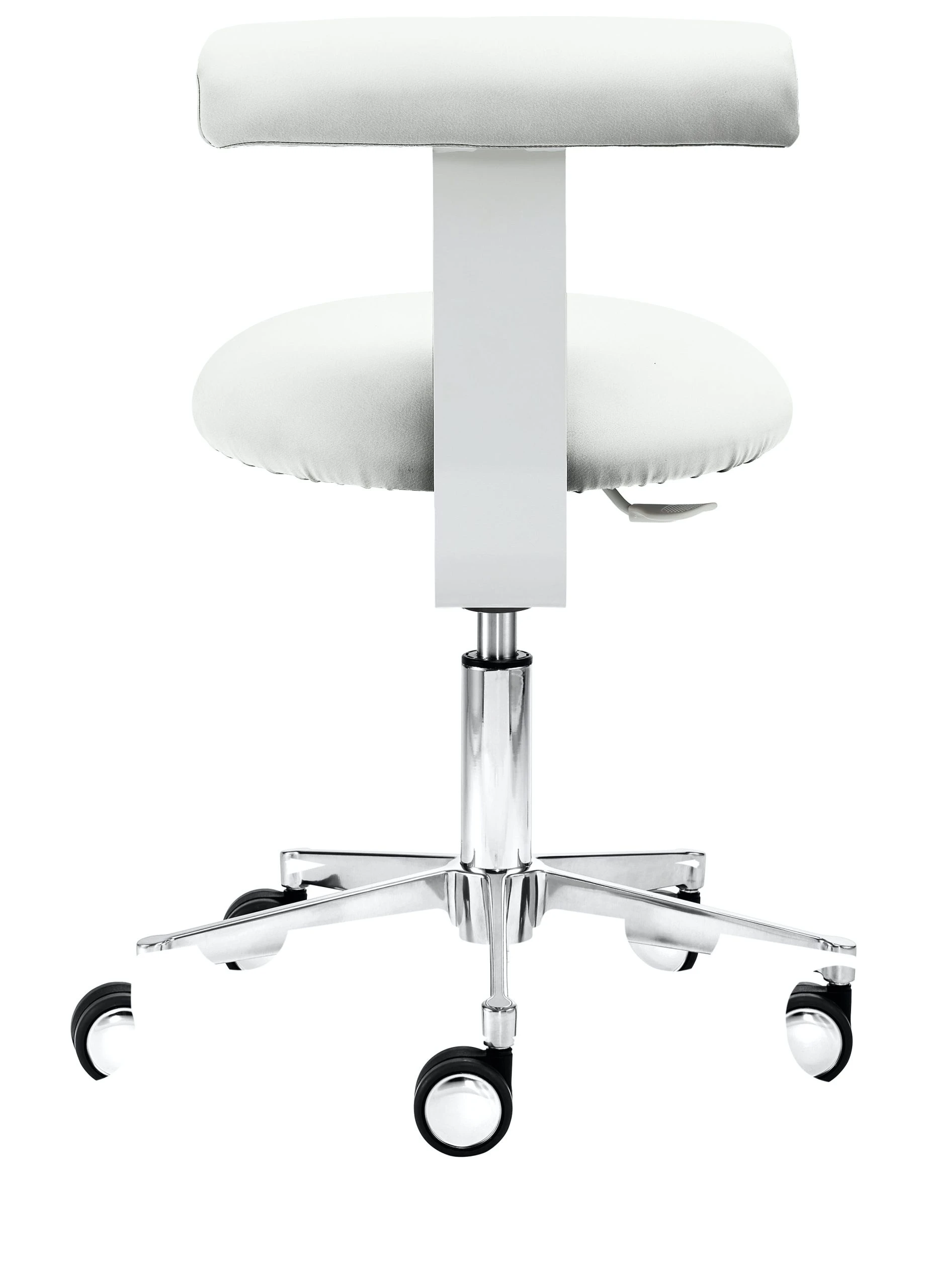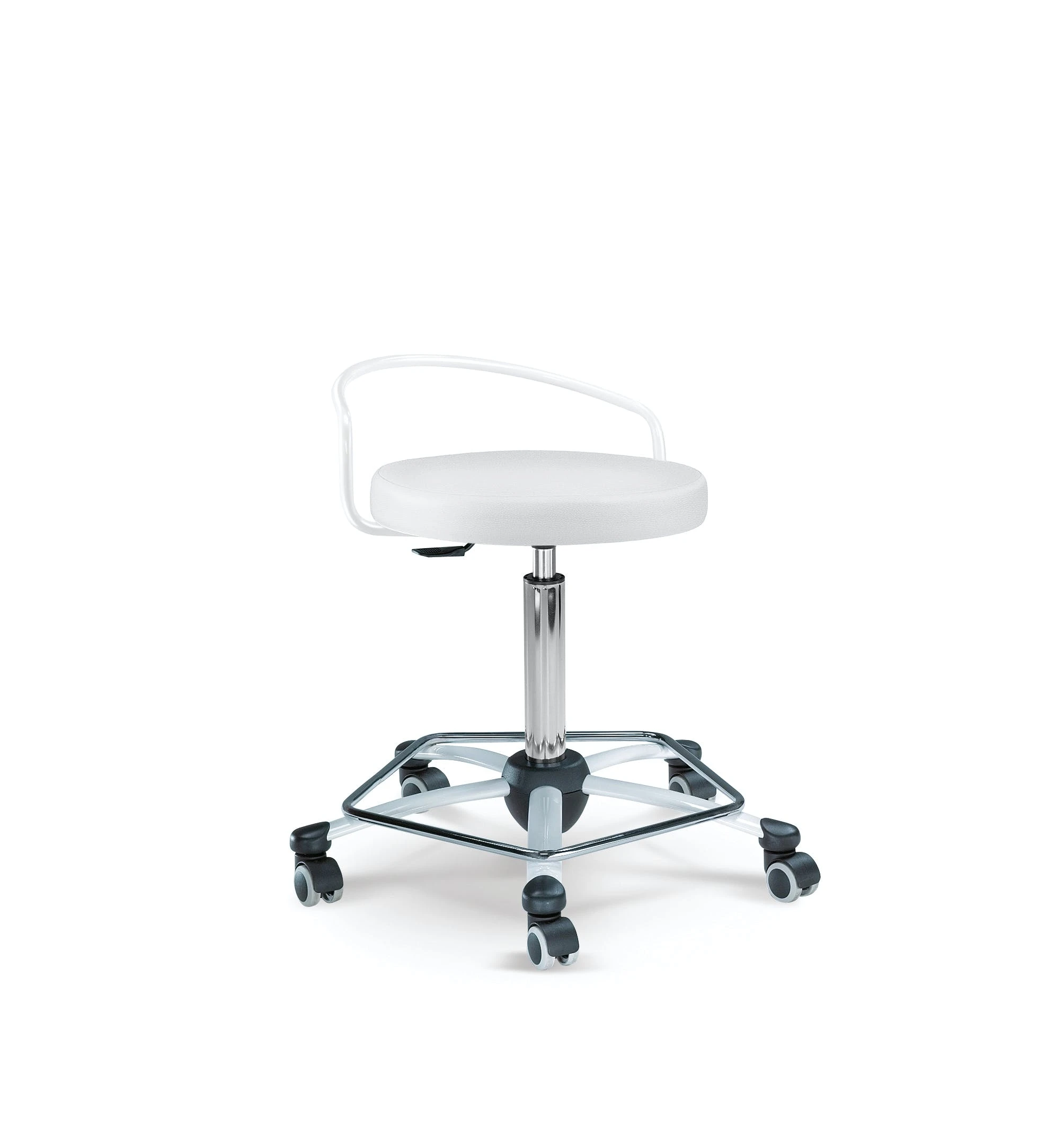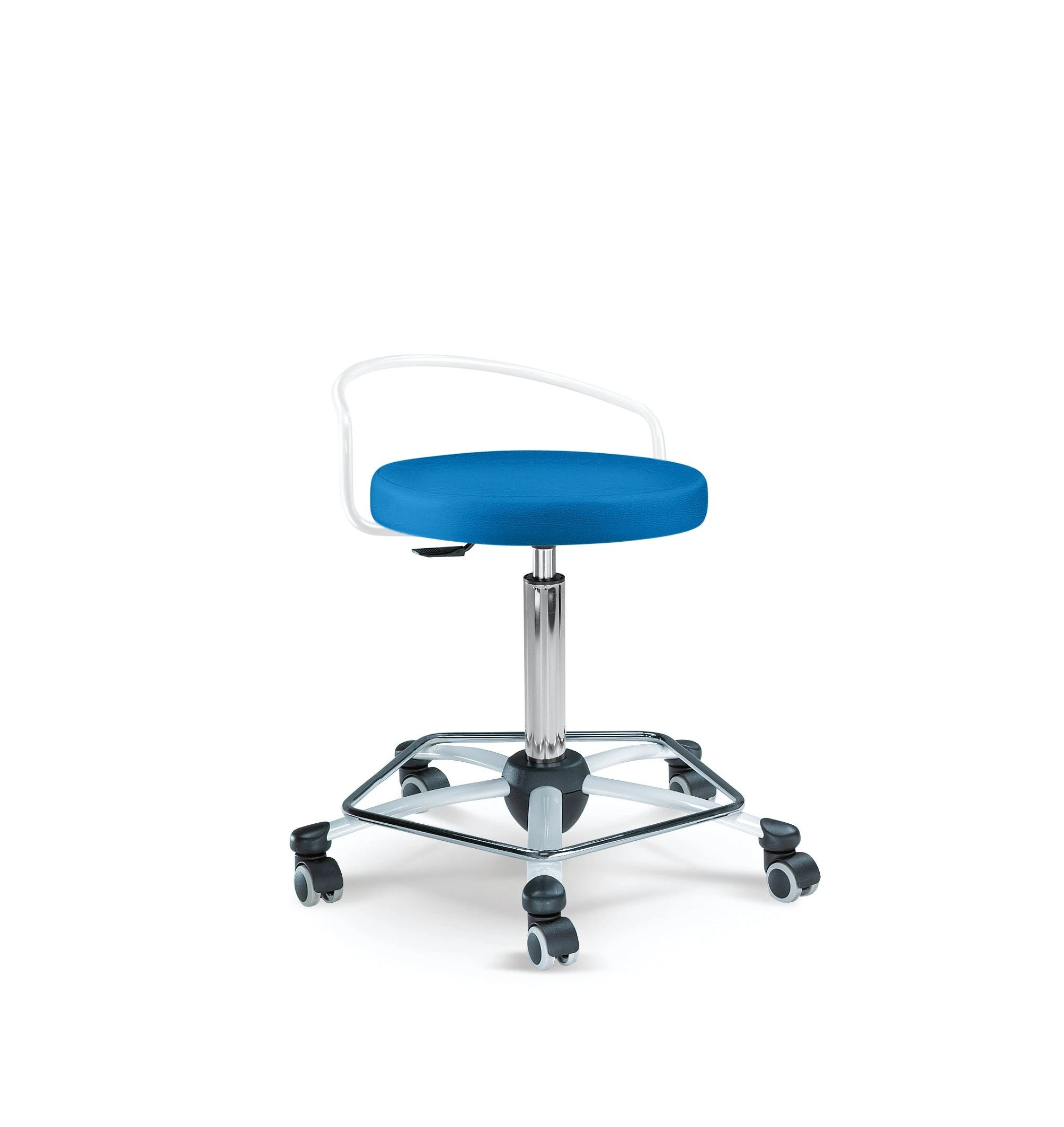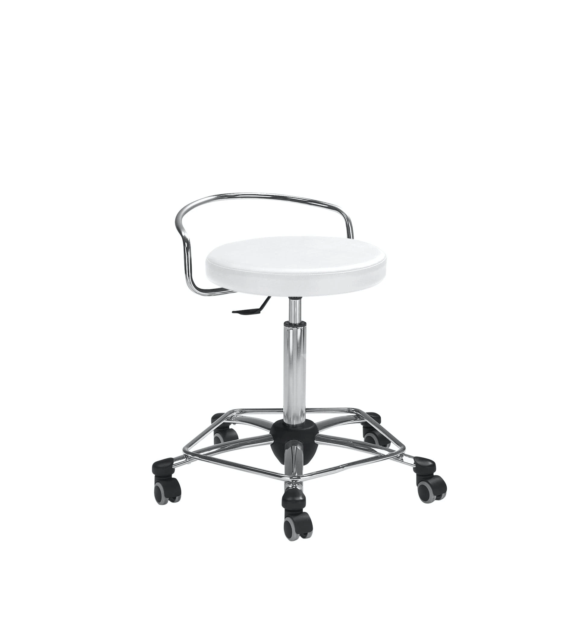 Gestell Chrom, Sitz gepolstert, stufenlose Höhenverstellung durch Gasfeder, inkl. Rollen für Hartböden, Sitzhöhe 54 – 74 cm.