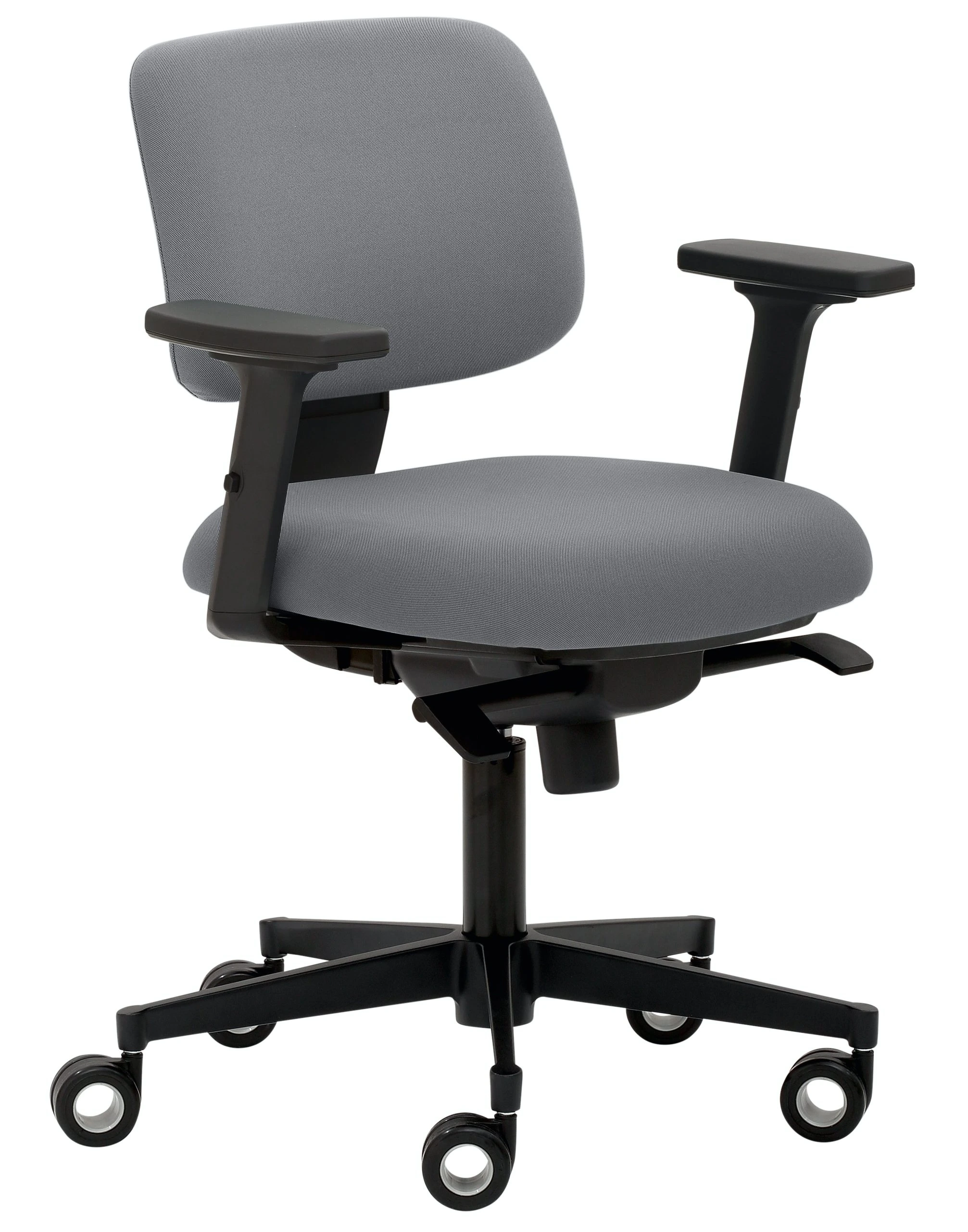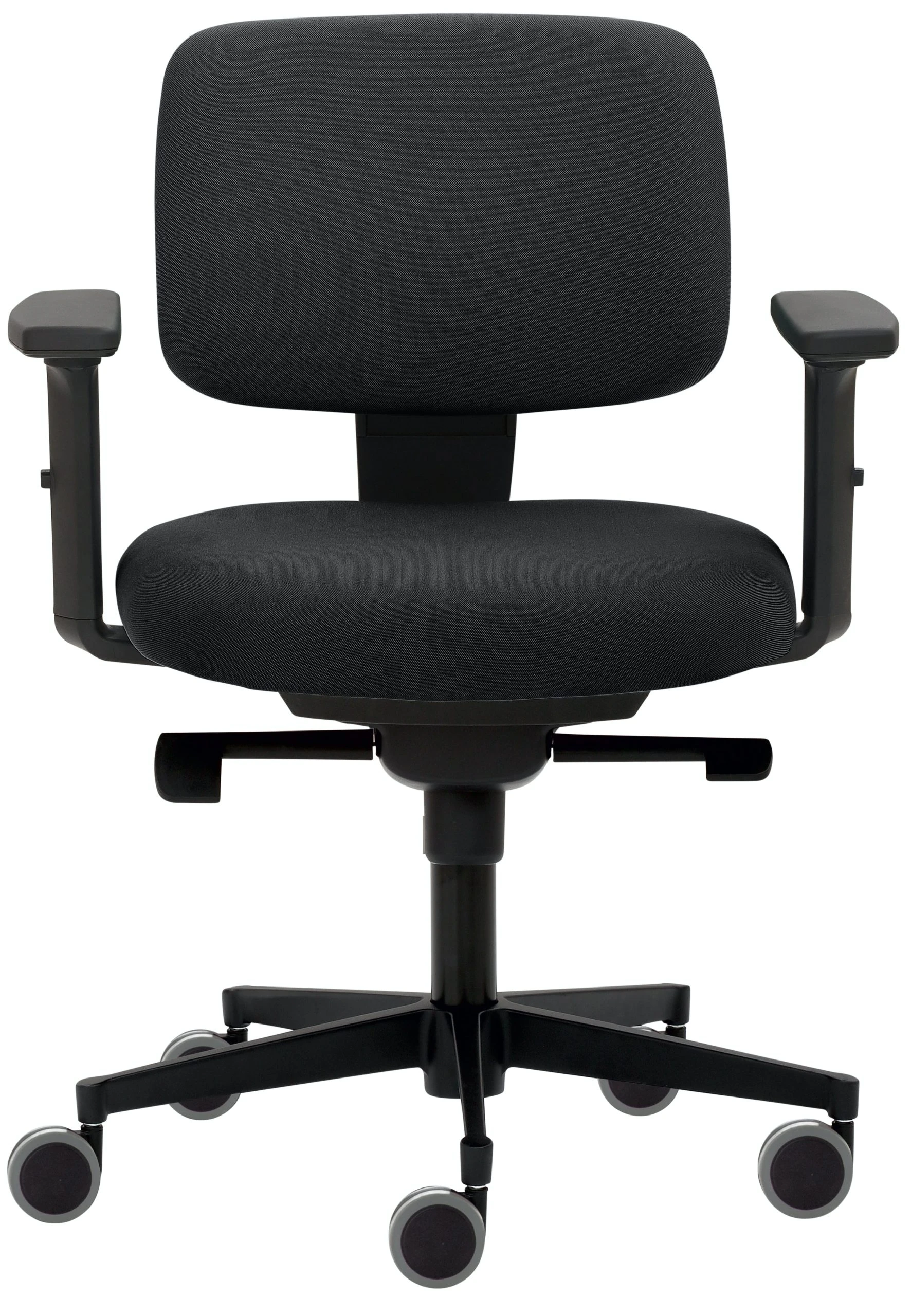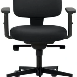 Kleiner Rücken, Sitz und Rücken gepolstert, Rücken-Raster-Höhenverstellung, Synchronmechanik mit individueller Gewichtseinstellung und Sitztiefenverstellung, stufenlose Höhenverstellung durch Gasfeder, Kunststoff-Fußkreuz schwarz, inkl. große und schwarze Hartbodenrollen, Sitzhöhe 50 – 61 cm. 2D-Armlehnen schwarz.