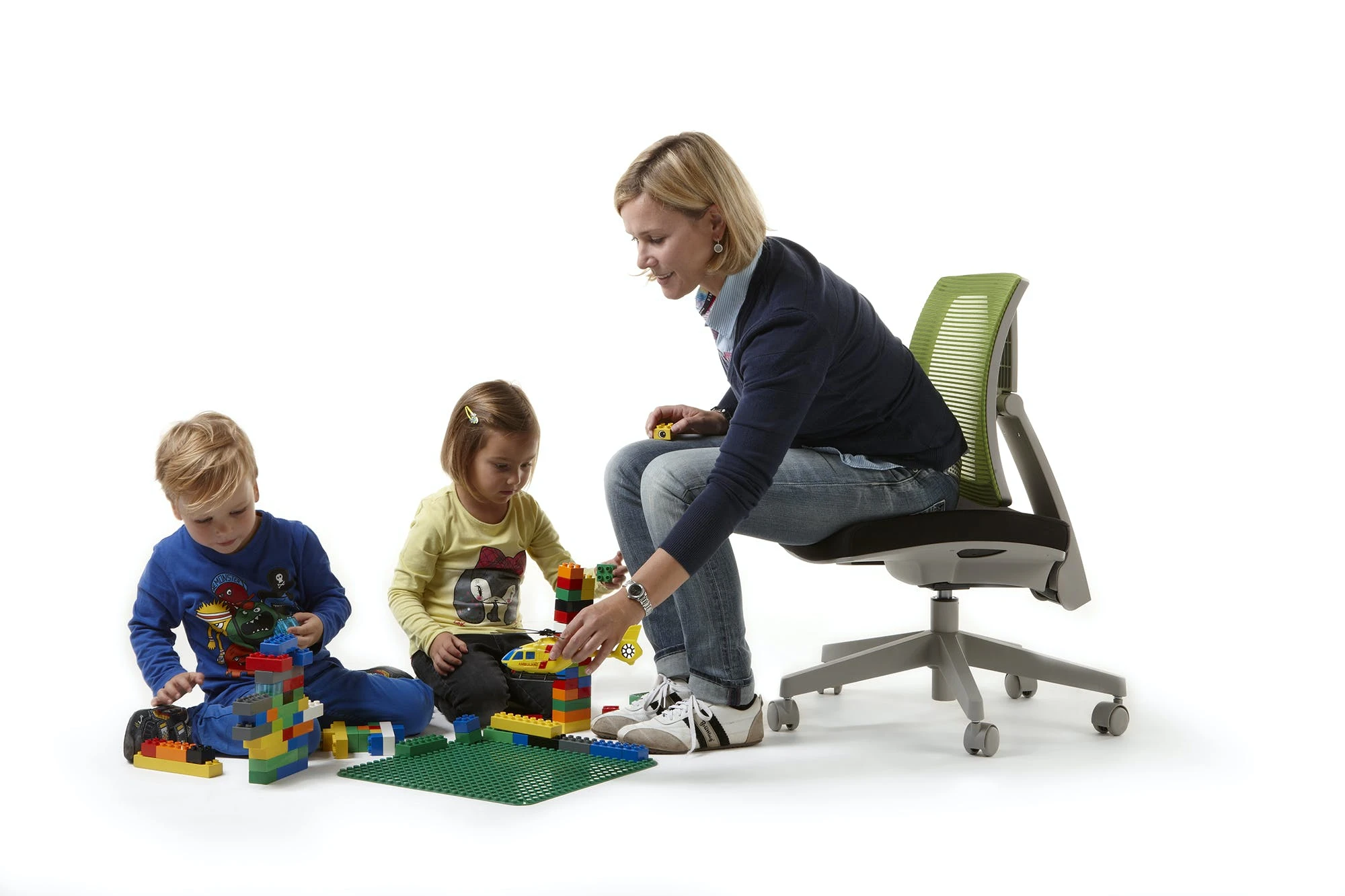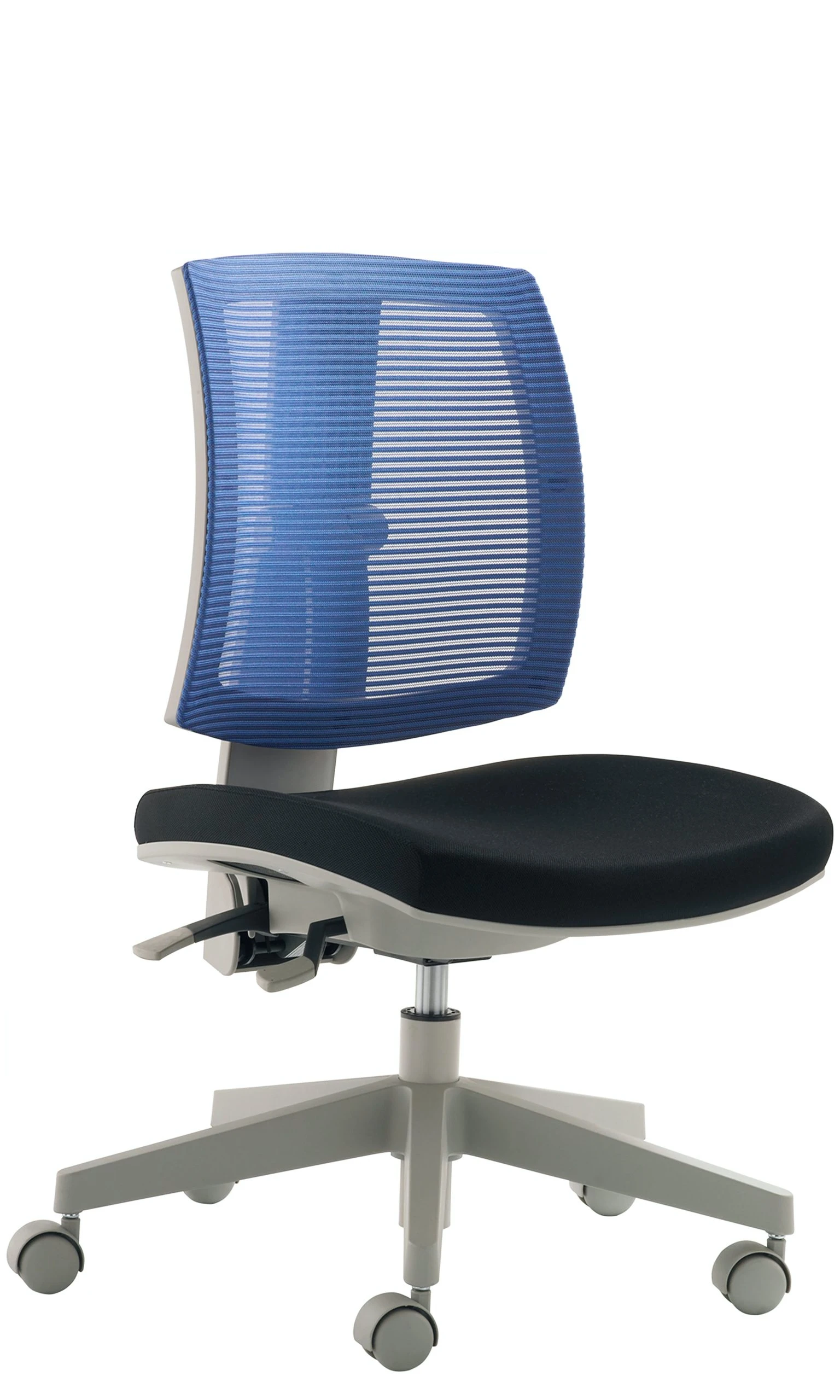 Gestell grau, Sitztiefe durch Rückenverstellung sehr leicht und stufenlos verstellbar, stufenlose Höhenverstellung durch Gasfeder, Fußkreuz Kunststoff grau, inkl. Universalrollen, Sitzhöhe 39 – 52 cm. Belastbar bis 150 kg. Sitz Stoff schwarz / Rücken Netz Grün.