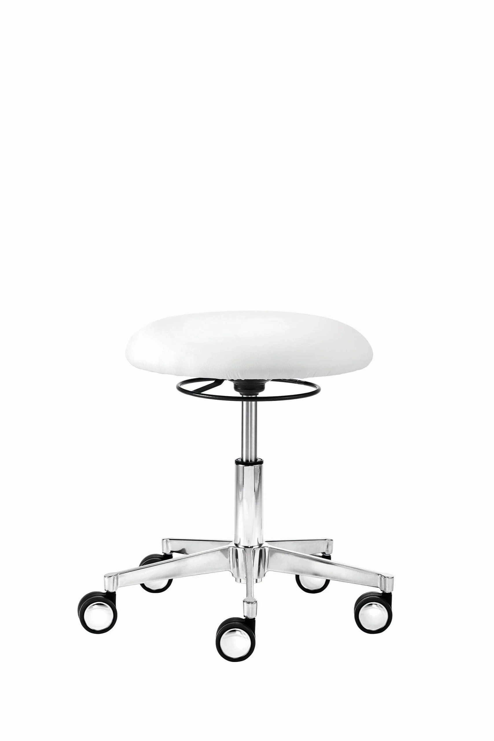 Mit Ergositz, stufenlose Höhenverstellung durch Gasfeder, Bewegungsfreiheit 360°, Hebelauslöser, Alu-Fußkreuz (ø 52 cm), inkl. Hartbodenrollen mit Chromblenden, Sitzhöhe 39 – 50 cm.