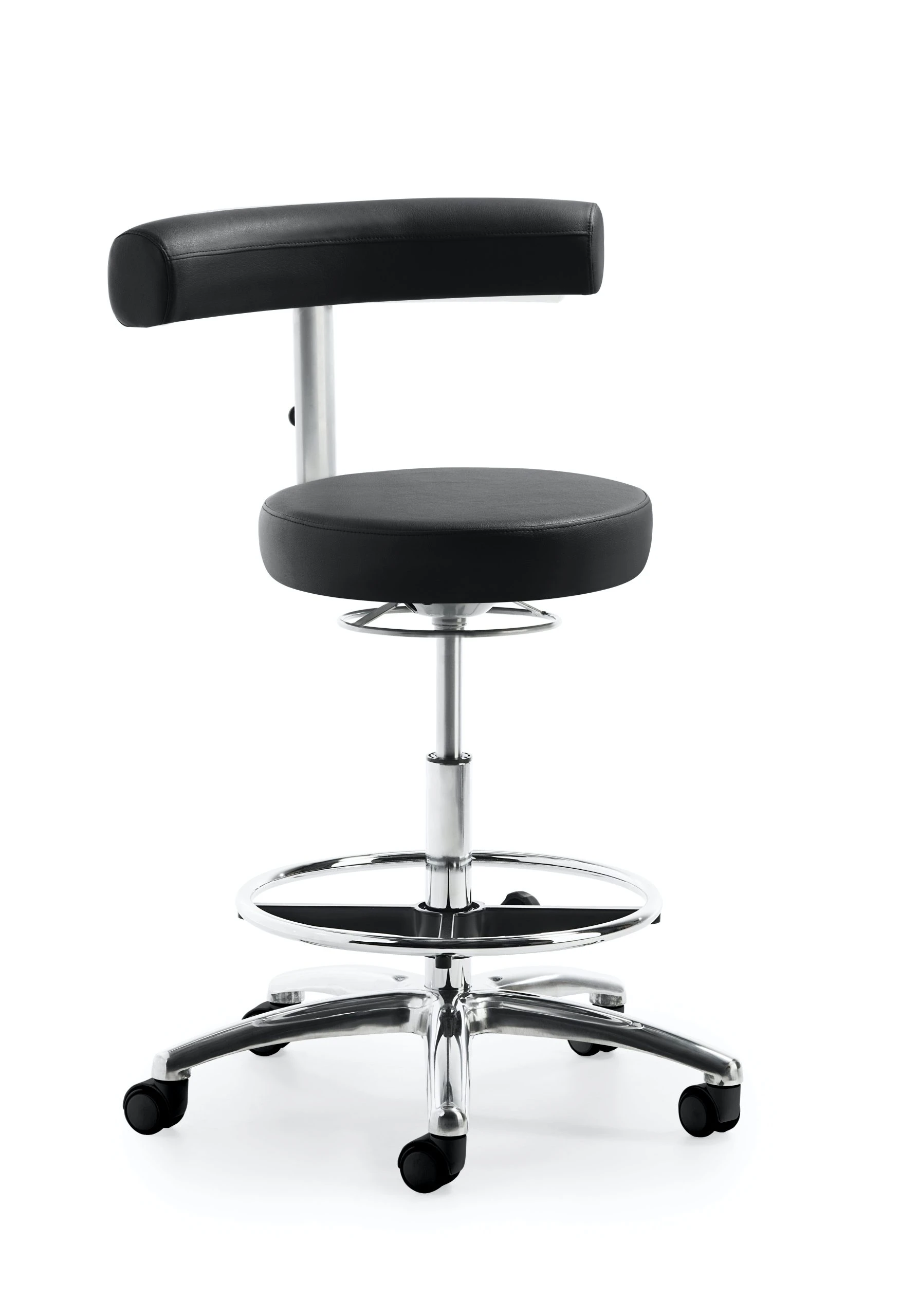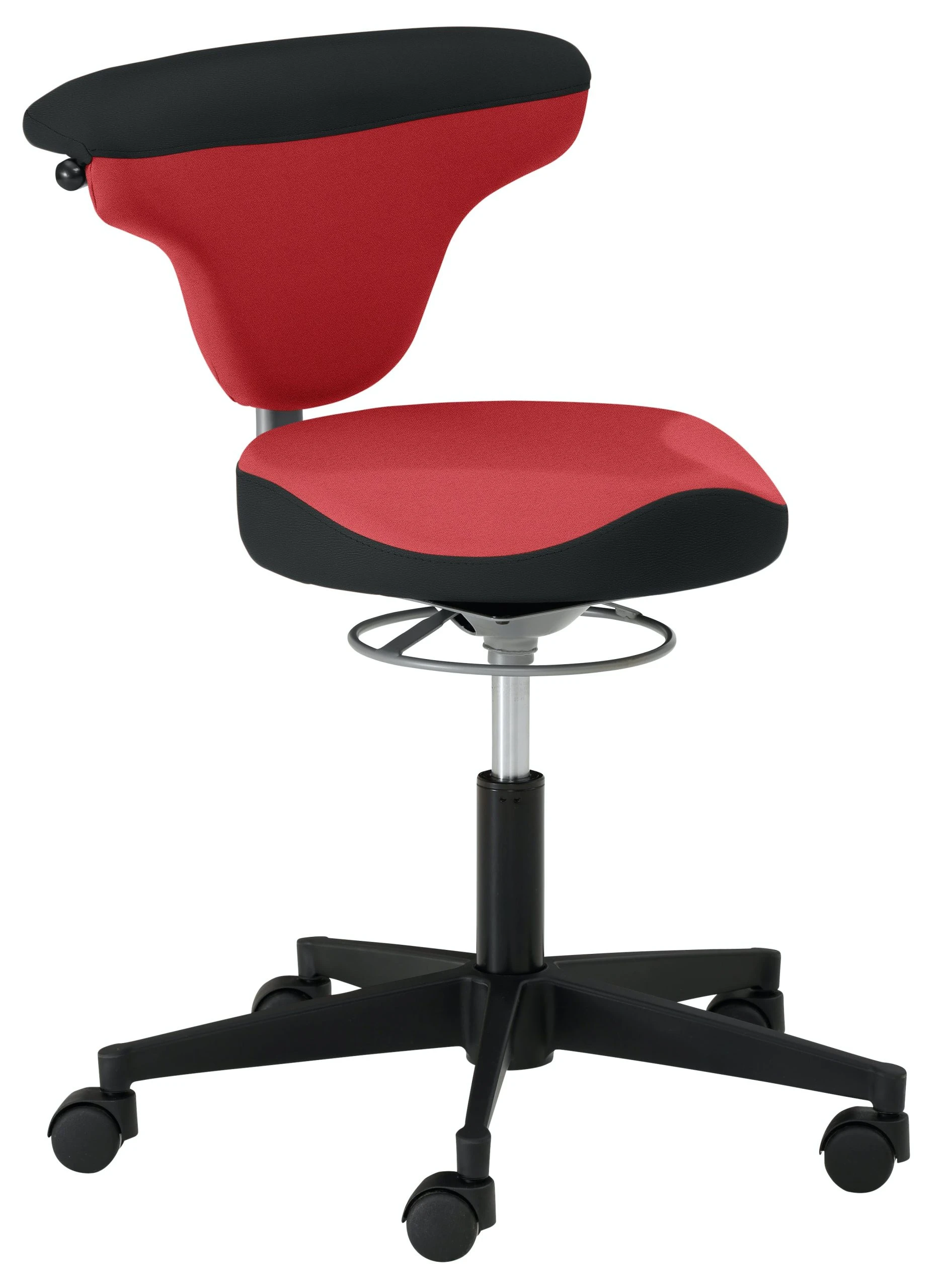 Sitz und Rücken gepolstert, unifarben oder kombiniert lieferbar, ergonomisch geformter Hockersitz aus hochwertigem Polyurethan mit Schichtholzeinlage, Rückenlehne/Armauflage 360° drehbar, stufenlose Höhenverstellung mittels Ringauslöser, Gasfeder schwarz, Kunststoff-Fußkreuz schwarz (Ø 61 cm), Gestell und Ringauslöser perlsilber, inkl. Rollen für Teppichböden, Sitzhöhe 39 – 50 cm (besonders niedrig), belastbar bis 140 kg.