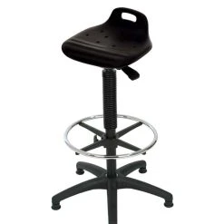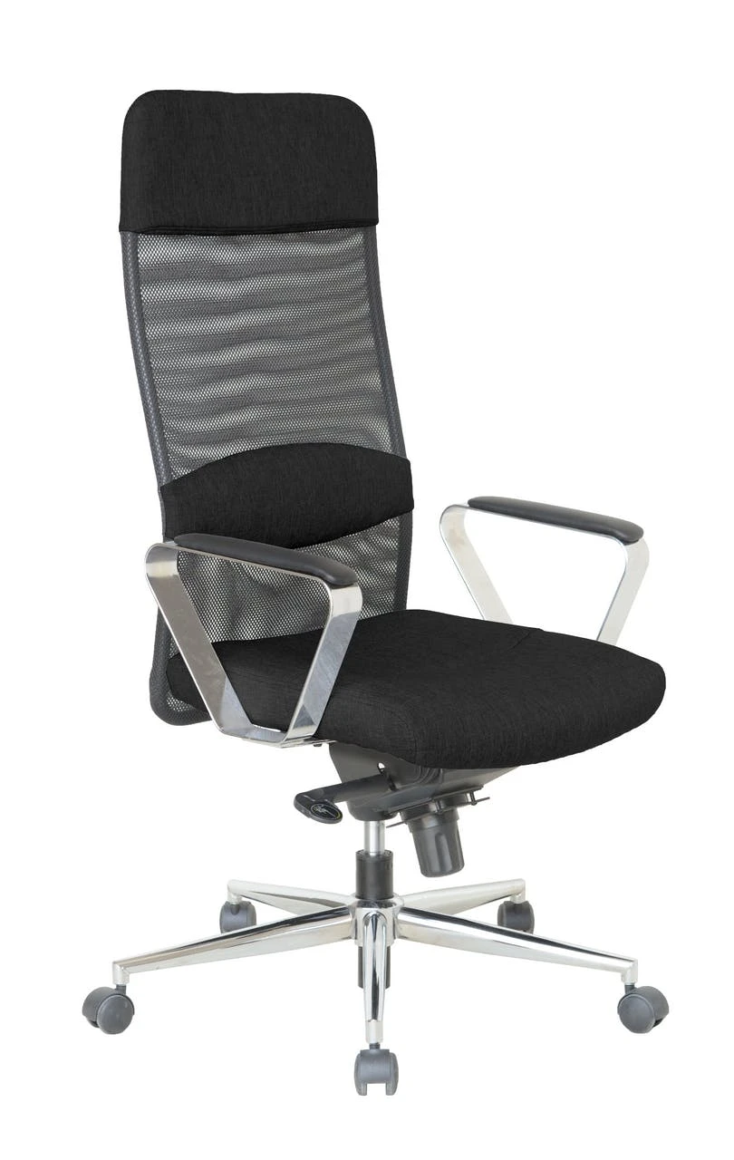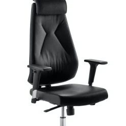Der Chefsessel GX-A28D61 ist mit PU-Leder bezogen und verfügt über eine einfache Wippmechanik, feste Armlehnen, ein Fußkreuz aus Kunststoff und gebremste Sicherheitsrollen. Das Produkt ist feuerresistent nach DIN-EN 10211/2.