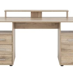 Die Tischplatte ist mit Melaminharz der Güteklasse E1 beschichtet und dadurch besonders robust. Die Tischplatte garantiert durch die ABS Kanten einen hohen Komfort. Durch die Schränke an den jeweiligen Seite ist der Tisch sehr stabil und wackelt absolut gar nicht. Der Schreibtisch bietet genügend Platz für Bildschirm, Rechner und Tastatur, sowie jeglicher Schreibunterlagen.