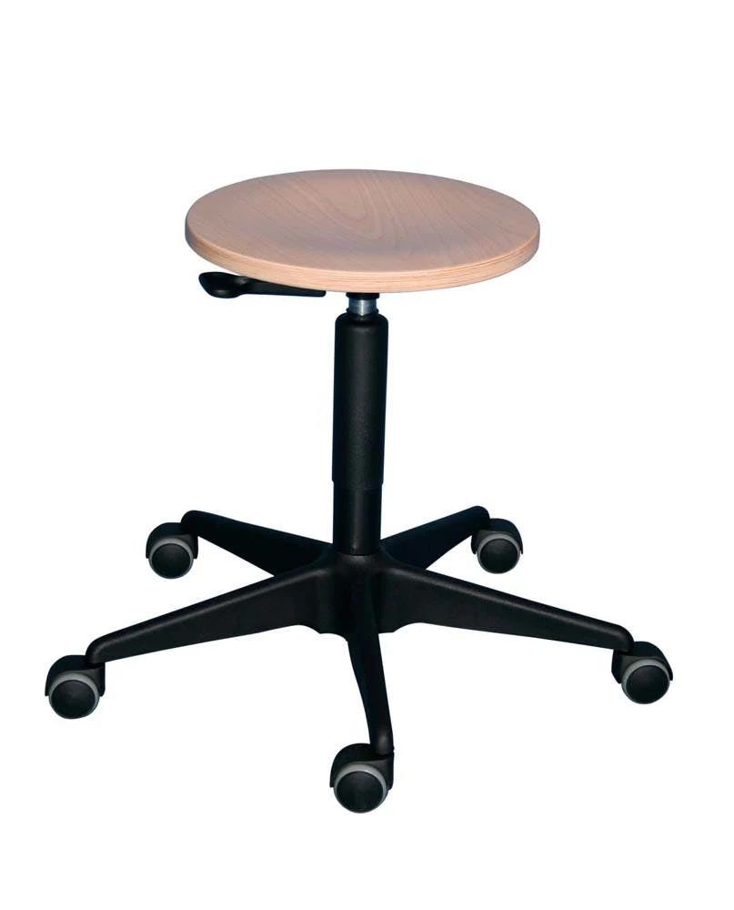 Die Höhe kann stufenlos verstellt werden. Die Höhneinstellung erfolgt über einen Ringauslöser (Hebelauslösung bei PU- und Buche-Sitz möglich). Die Belastbarkeit beträgt 110 kg. Das abgedeckte Stahlfußkreuz ist sehr stabil.