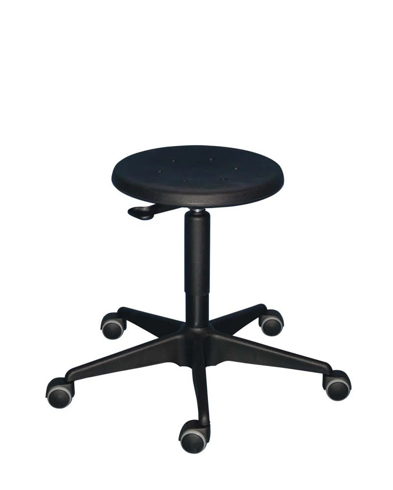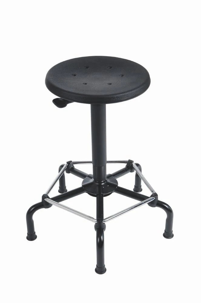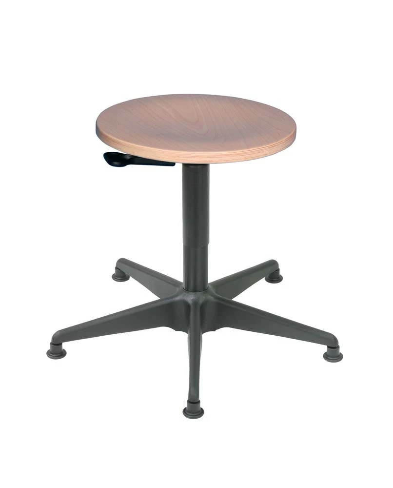Die Höhe kann stufenlos verstellt werden. Die Höhneinstellung erfolgt über einen Ringauslöser (Hebelauslösung bei PU- und Buche-Sitz möglich). Die Belastbarkeit beträgt 110 kg. Das abgedeckte Stahlfußkreuz ist sehr stabil.
