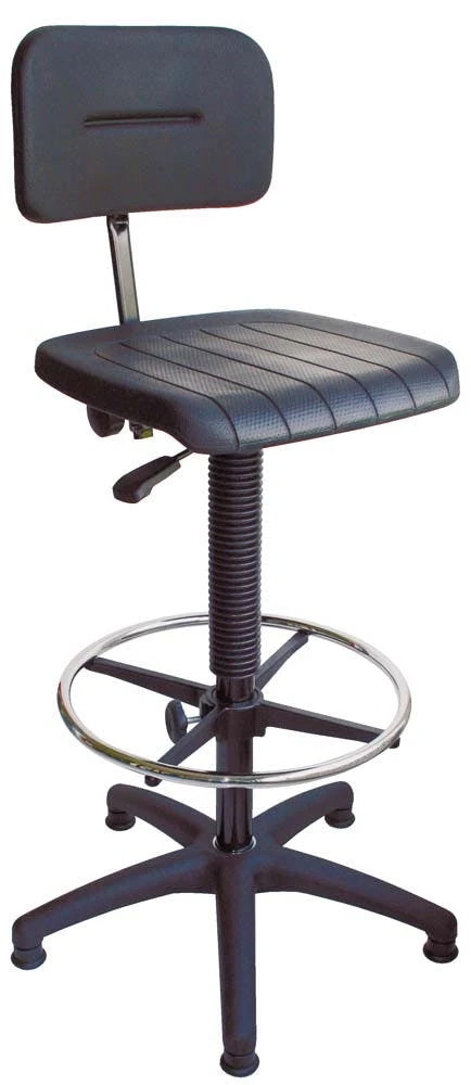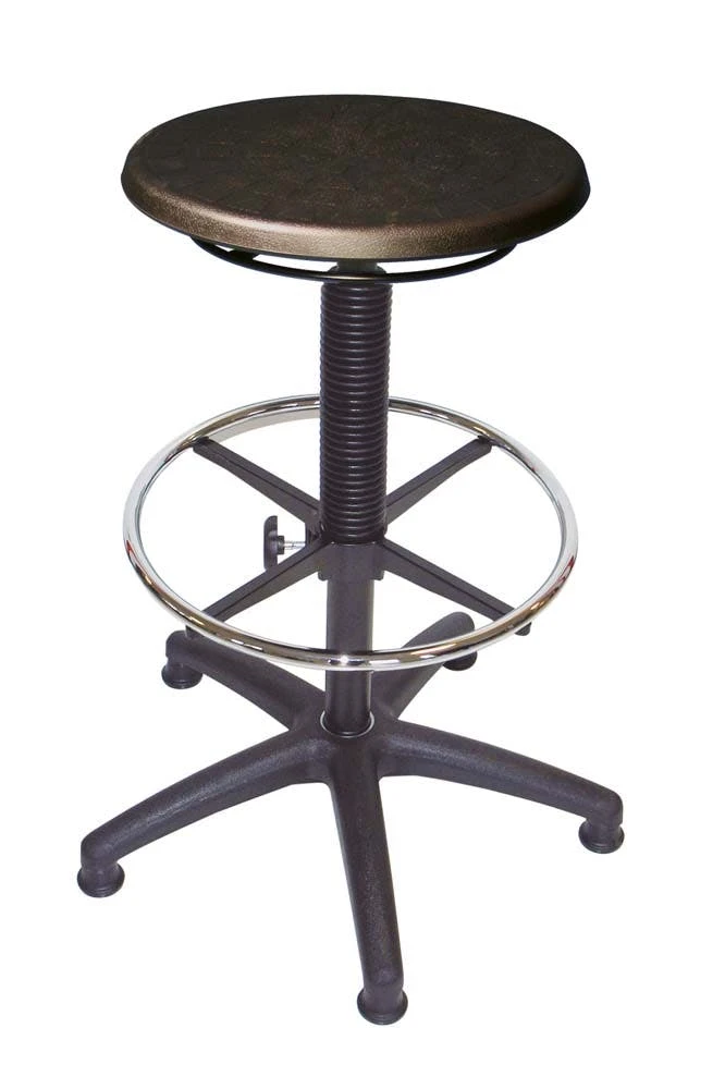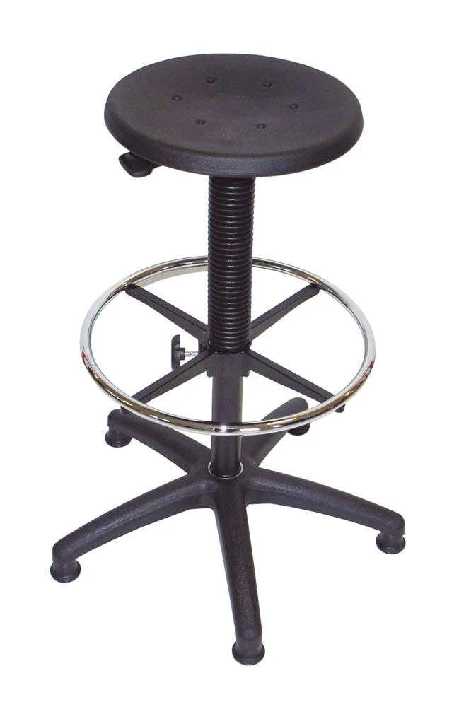 Die Höhe kann stufenlos verstellt werden. Die Höhneinstellung erfolgt über einen Ringauslöser (Hebelauslösung bei PU-Sitz möglich). Die Belastbarkeit beträgt 110 kg. Der Fußring ist unabhängig von der Sitzhöhe einstellbar.